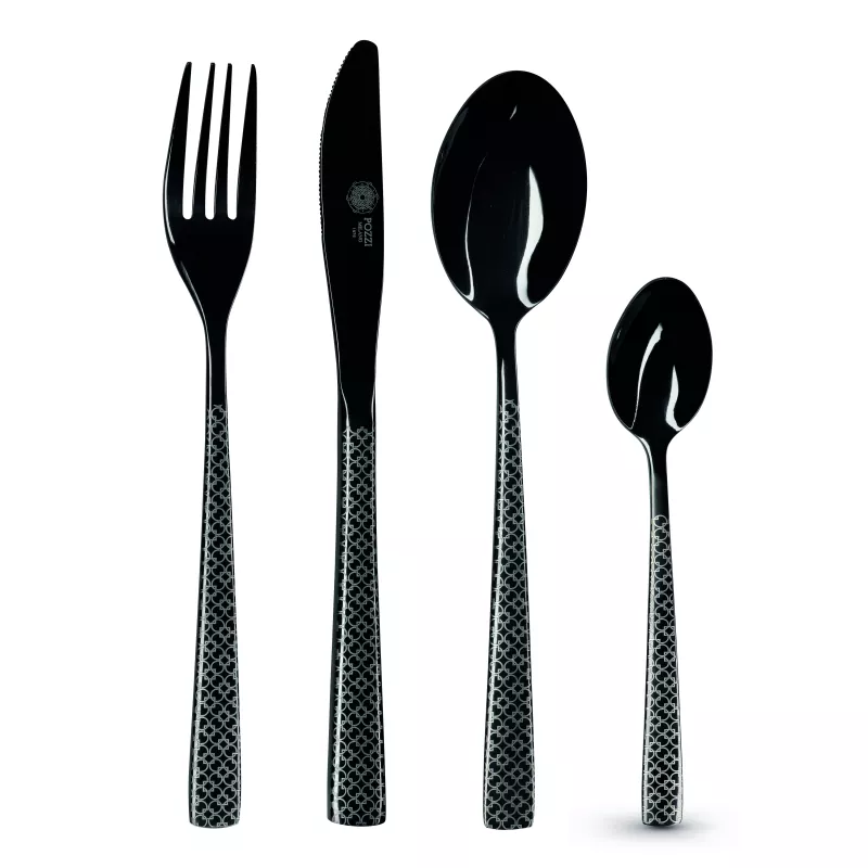 Conçus en acier inoxydable 18/0 de qualité supérieure, ces couverts séduisent par leur élégante finition noire et leurs motifs géométriques contemporains.