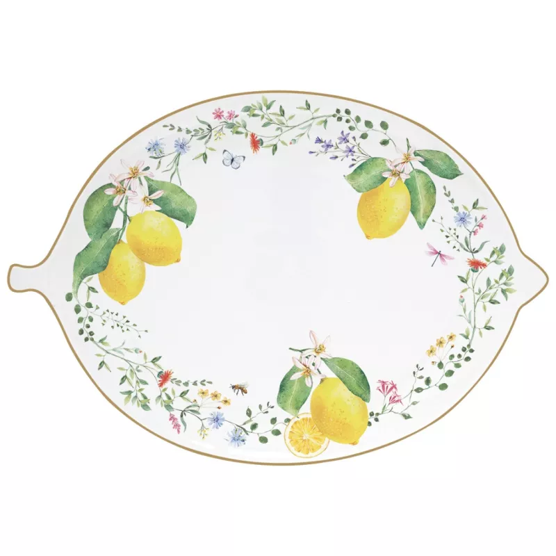 Ce plat ovale au design original en forme de citron est dĂ©corĂ© de magnifiques motifs de citrons et de fleurs.Â