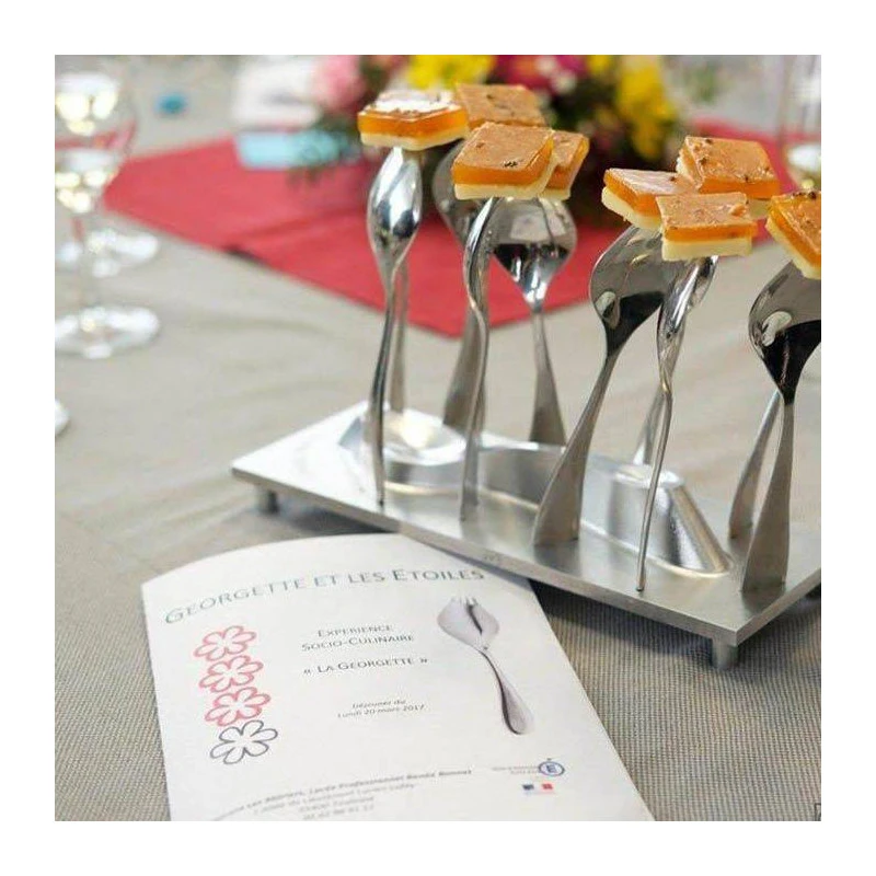 - Fourchette, cuillère et couteau Ă la fois, la GEORGETTE® est l’ustensile insolite et Ă©lĂ©gant, au service de l’amuse-bouche jusqu’au dessert.