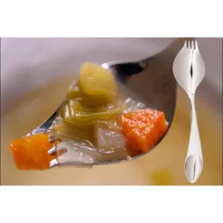 - Un manche ergonomique profilé et équilibré, constituent cet ustensile original réunissant à lui seul les fonctions séparatives des trois couverts habituels.