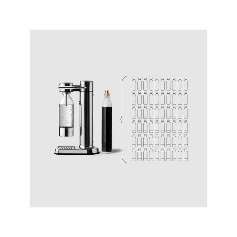 Une bouteille de gaz CO2 utilisée pour alimenter le Carbonator Aarke vous fournira environ 60 bouteilles d’eau gazéifiées.